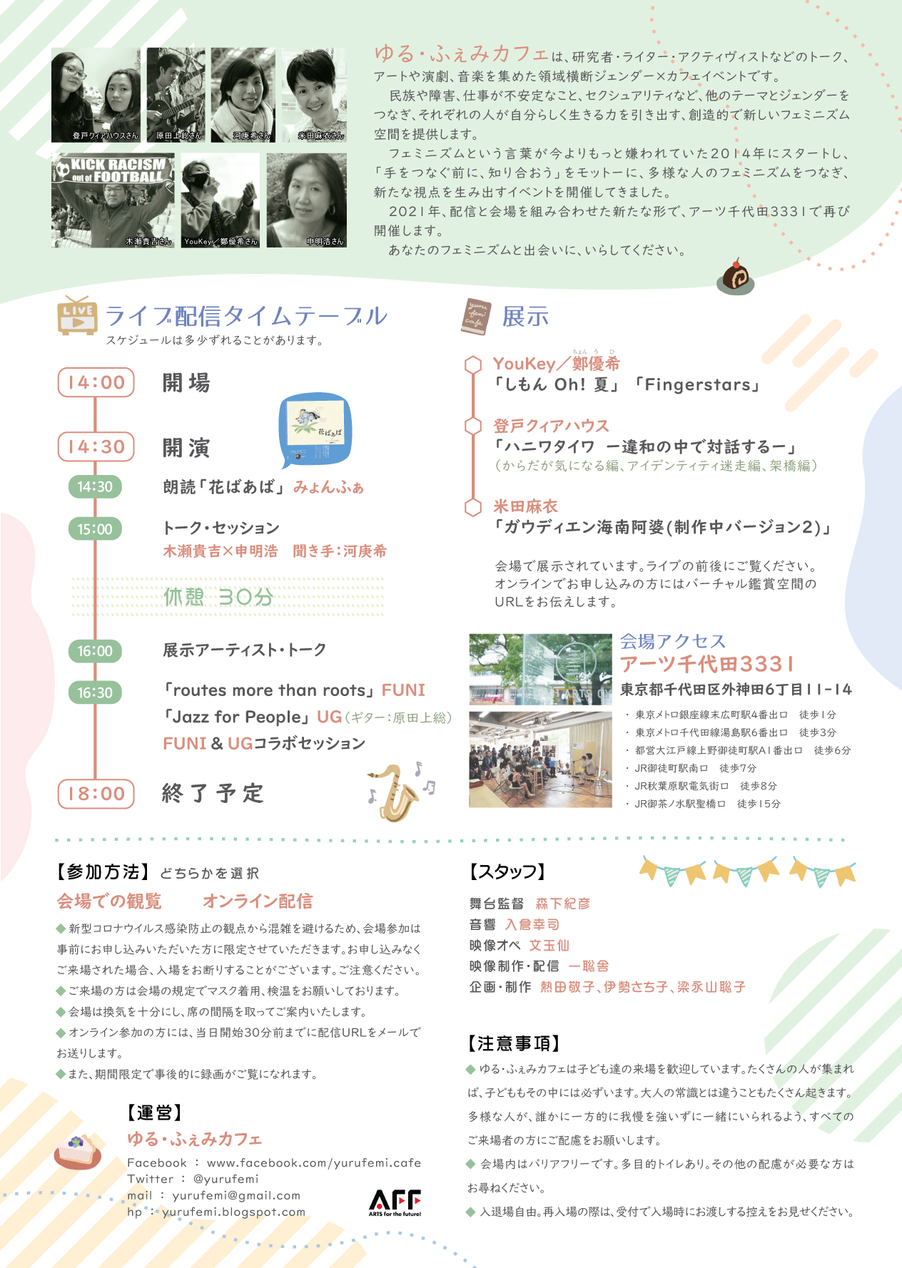 ゆる・ふぇみカフェは、研究者・ライター・アクティヴィストなどのトーク、アートや演劇、音楽、フリマを集めた領域横断ジェンダー×カフェイベントです。